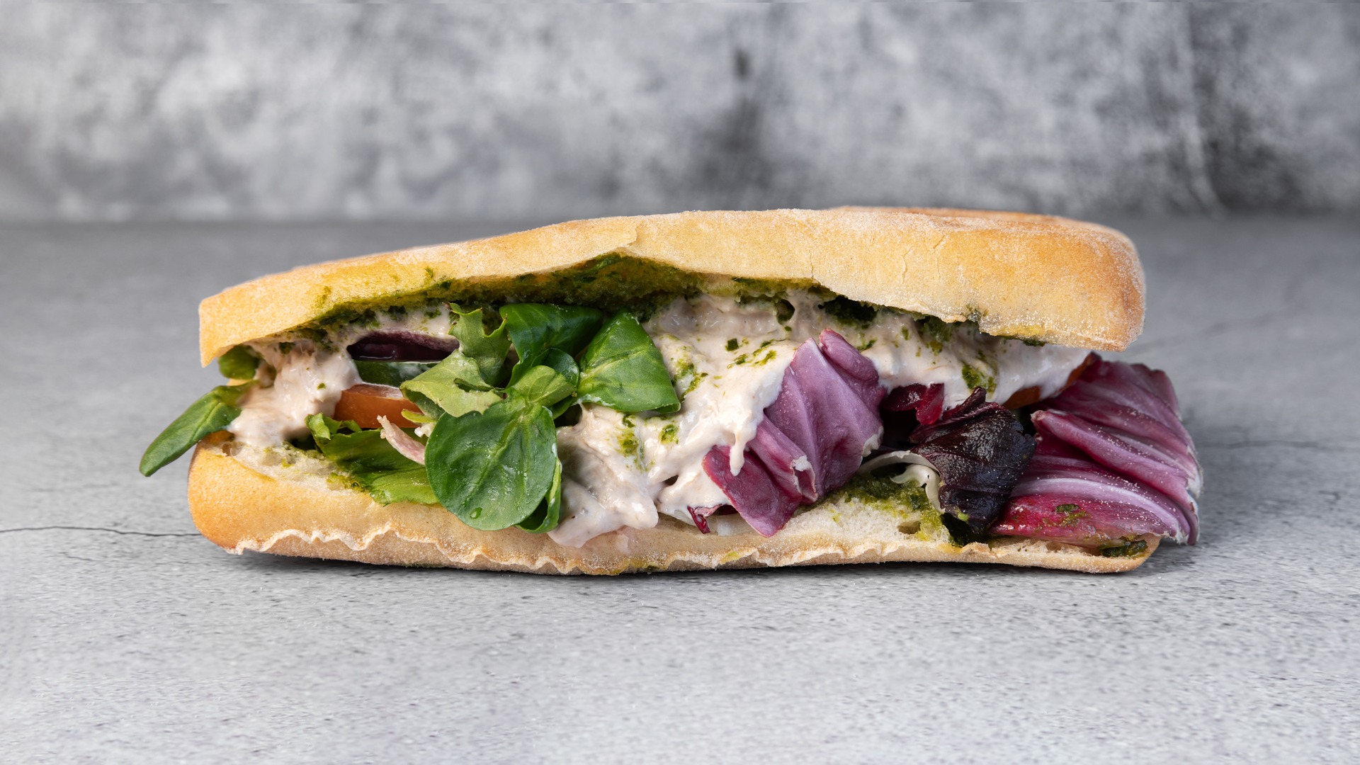 Tunsalat, salat, tomat, agurk, syltede rødløg, basilikumpesto