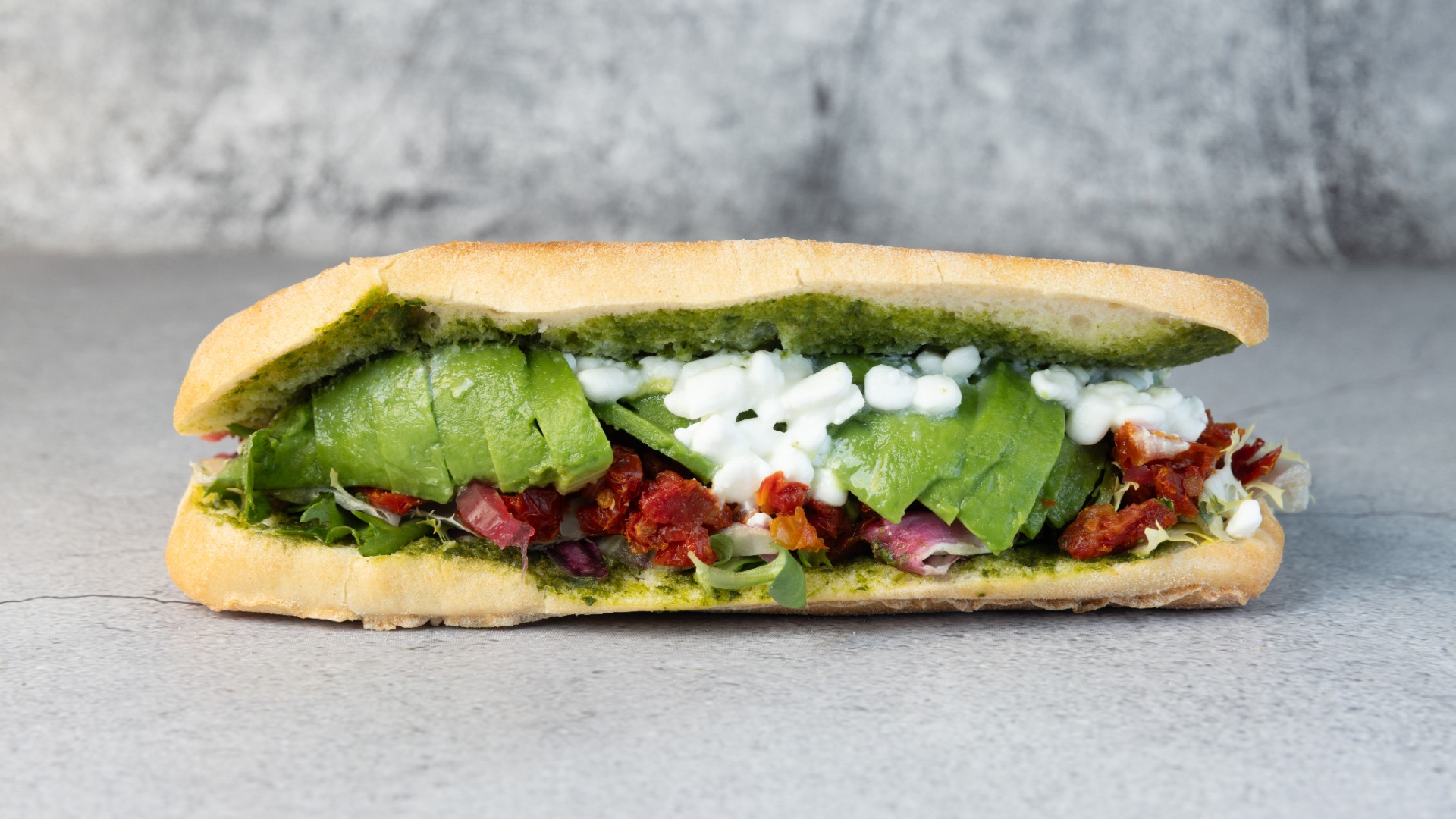 Avocado, salat, hytteost, soltørrede tomater, syltede rødløg, pesto