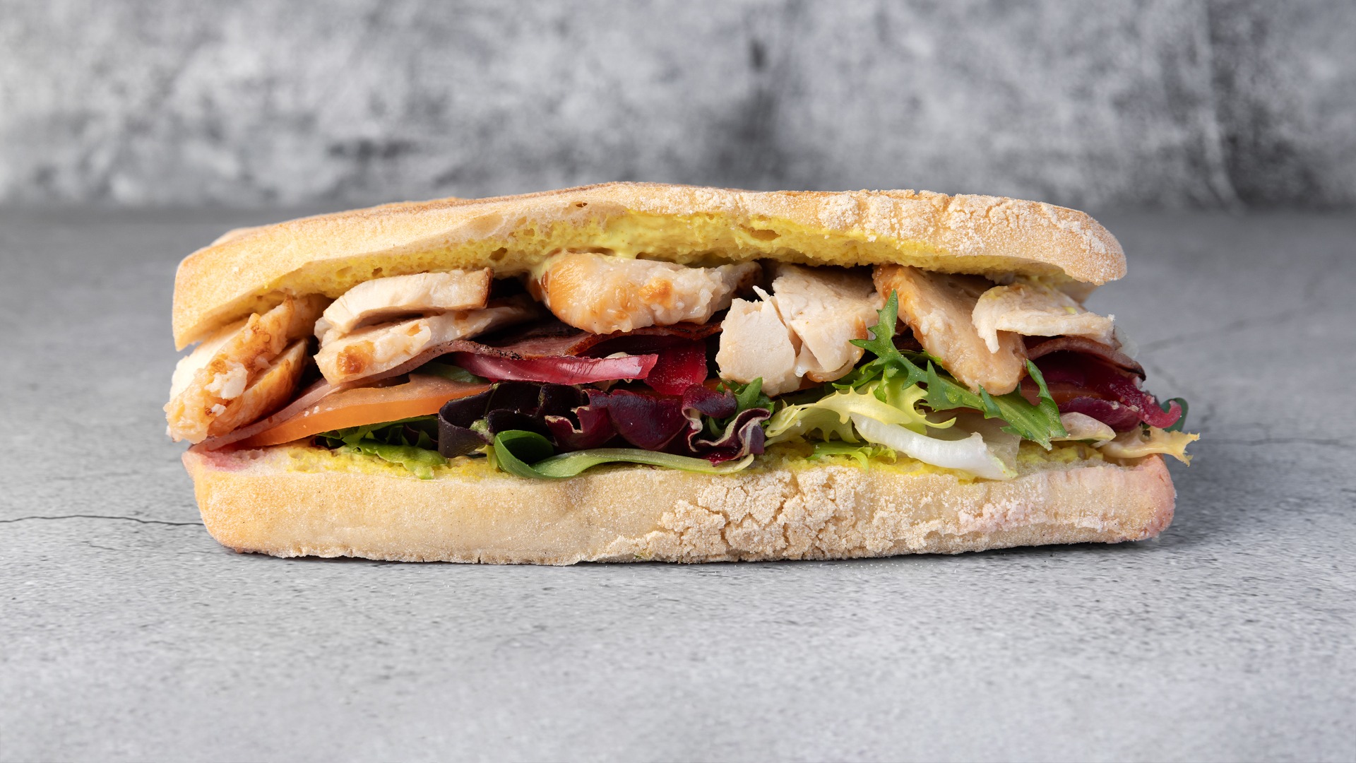 Kylling, salat, tomat, agurk, rødløg, kalkunbacon, karrydressing